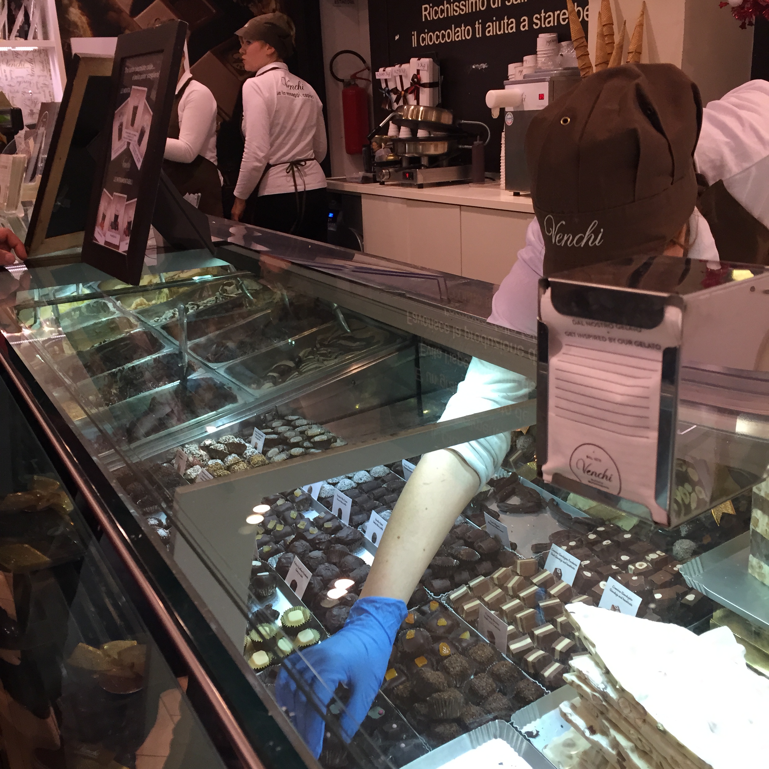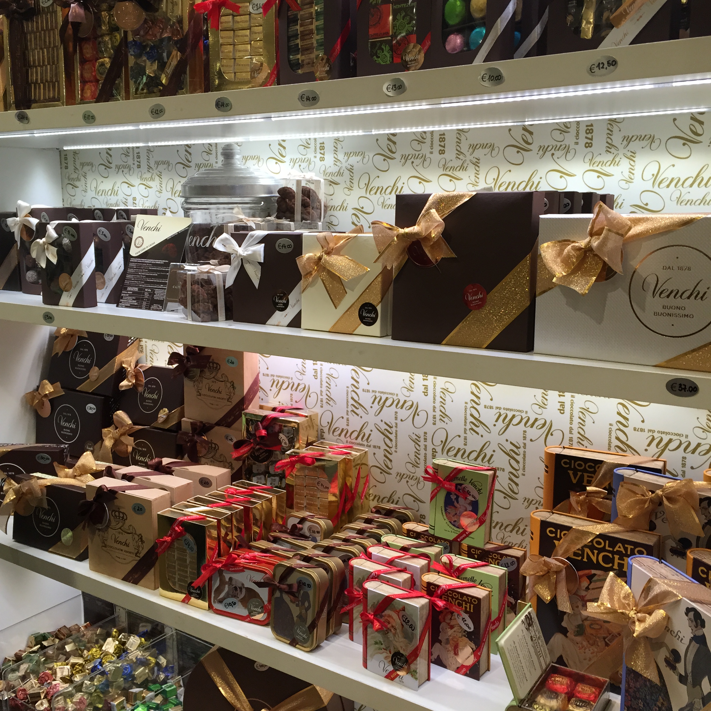 A poucos metros de distância da Pompi, está a tradicional chocolateira Venchi. Criado pelo italiano Silvano Venchi em 1878, é o chocolate mais renomado do país. O produto pode ser comprado avulso, como se vê abaixo na foto, ou em caixinhas já decoradas para presente. Um luxo! Os preços variam de acordo com o tipo de chocolate e a quantidade escolhida.